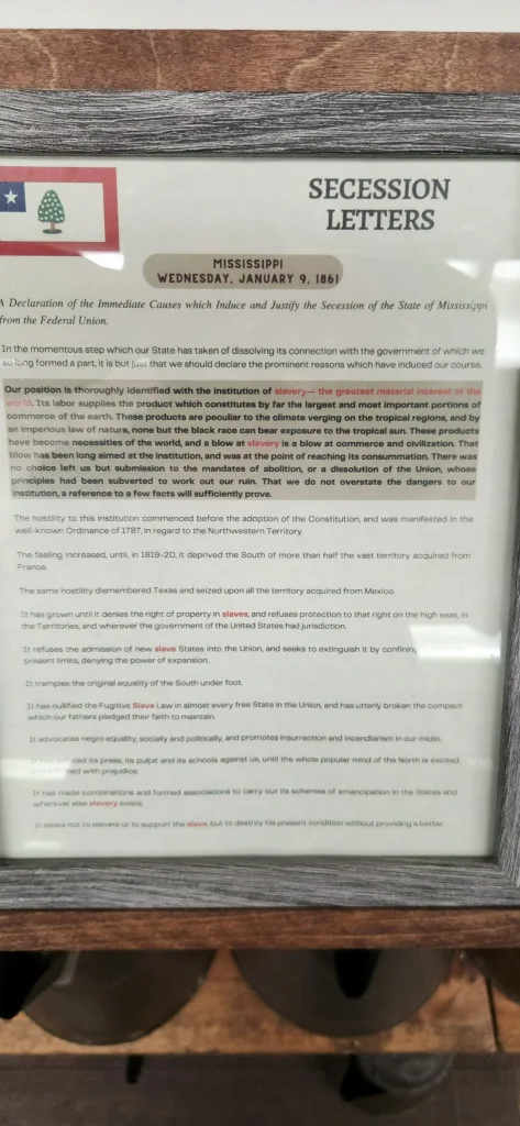 As you move through the space, he doesn’t rush you. He encourages you to actually read what’s on the walls. One display shows the 11 Southern states that formed the Confederacy, laid out in the order they seceded. Mississippi was second.